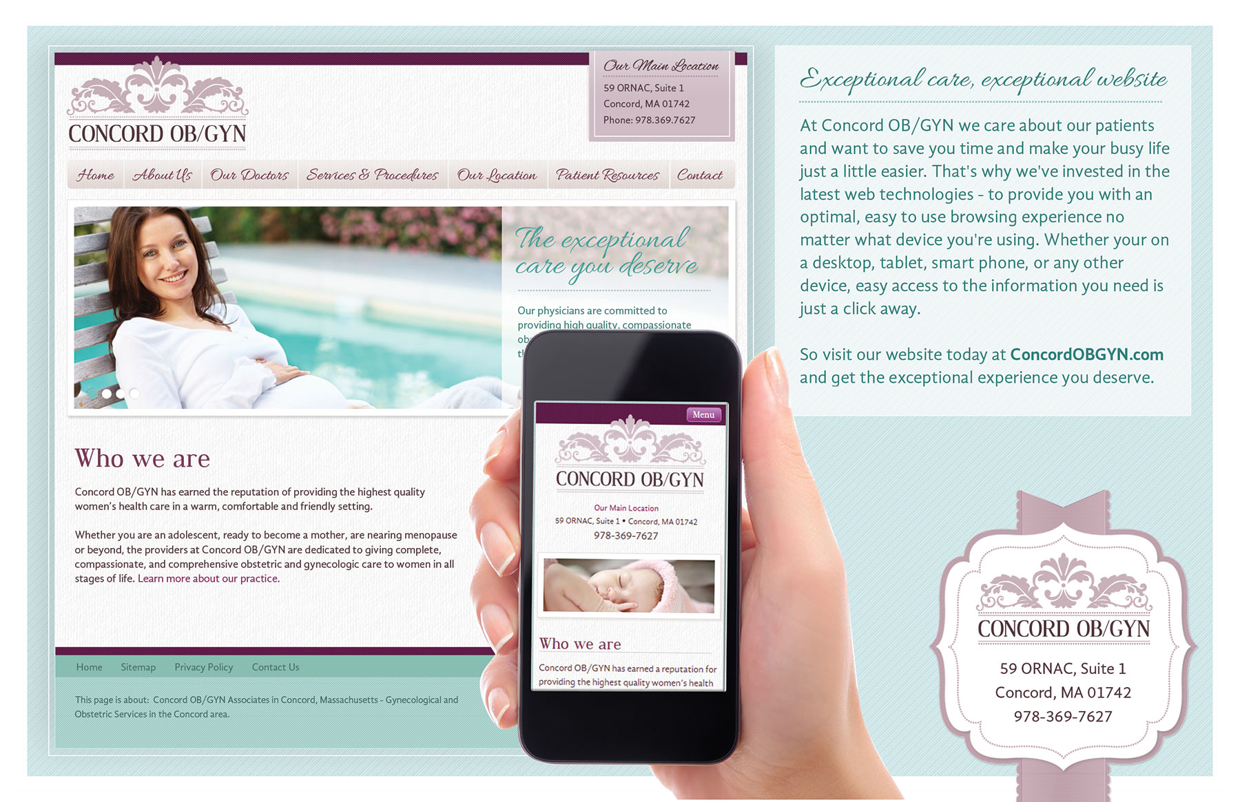 I created this oversized post card for Concord OB/GYN to mail and hand out within their office to announce the launch of their new website to make patients aware of the resources available to them on this new site. Admittedly, the baby image is somewhat creepy — but they were jazzed about it.